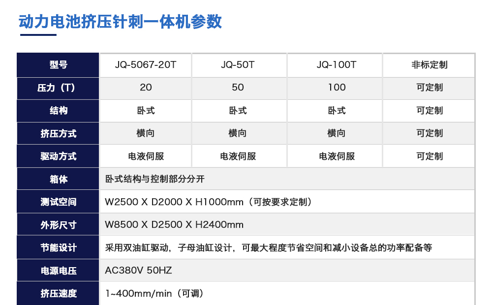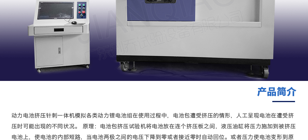 產(chǎn)品型號(hào):JQ-5067-20T(可定制) 品牌:劍 喬 用途:動(dòng)力電池?cái)D壓針刺一體機(jī)模擬各類動(dòng)力鋰電池組在使用過程中,電池包遭受擠壓的情形,人工呈現(xiàn)電池在遭受擠壓時(shí)可能出現(xiàn)的不同狀況。 原理:電池包擠壓試驗(yàn)機(jī)將電池放在連個(gè)擠壓咨詢熱線:13829135130