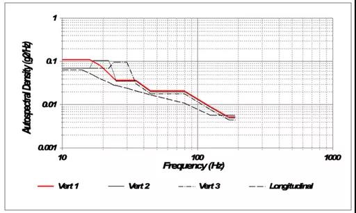 SAE J2380標(biāo)準(zhǔn)振動(dòng)目標(biāo)譜基于實(shí)際道路測(cè)量數(shù)據(jù),旨在模擬行駛10萬英里對(duì)電池組和模塊的影響。該標(biāo)準(zhǔn)要求一系列隨機(jī)振動(dòng)目標(biāo)譜應(yīng)用于三個(gè)垂直軸,試驗(yàn)時(shí)長(zhǎng)從9分鐘到38小時(shí)不等。