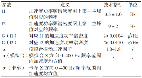 模擬運輸臺的設(shè)計參數(shù)主要依據(jù)《QJ/T 815.2-94產(chǎn)品公路運輸加速模擬試驗方法》[3]設(shè)定。該標準中規(guī)定了模擬運輸臺的關(guān)鍵技術(shù)指標,見表1。