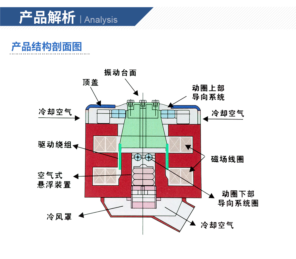 性能特點:●強制風冷 ●正弦激振力范圍: 1kN ~ 70kN●兩倍的正弦沖擊力(2噸以上可選三倍) ●輕質動圈,優(yōu)化設計,耐振性能強●中心氣囊承載能力強,低頻性能好 ●可配置水平滑臺●風機冷卻效果好,噪音低 ●使用頻率可從1Hz開始●隨機與正弦激振力1:1 ●位移峰峰值最大可達100mm●耳軸氣囊隔震效果好 ●雙磁路設計,漏磁低,磁場均勻●正弦、隨機、沖擊等試驗功能 ●高效率、高可靠性功率放大器系統(tǒng)特點:◎一階共振頻率高、使用頻率寬優(yōu)化的動圈骨架結構設計,特別是對傳統(tǒng)結構的動圈骨架傳力角板等薄弱環(huán)節(jié)進行增強設計,有效提高了傳力剛度;采用膠接與螺釘連接的復合固定繞線環(huán)筒和繞線環(huán)筒增強膠孔的新結構,增強了繞組的剛度。顯著提高了動圈的一階共振動頻率,超過了國際同類產(chǎn)品。◎動圈繞組可靠性高獨創(chuàng)的動圈繞組加強環(huán)的新結構和新工藝,顯著提高了動圈繞組工作在大推力、高加速度振動、沖擊和高溫環(huán)境中的耐振可靠性。◎風冷效率高創(chuàng)新的電動臺冷卻風道設計:改進了進風結構,上磁環(huán)用長槽型進風道取代圓孔型進風道;勵磁線圈采用蜂窩式風道、中磁環(huán)采用雙層風流式風道、下磁環(huán)采用斜楔型風道等新結構,顯著提高了冷卻效果。◎冷卻風機冷卻風機具有獨特的風道等結構設計,風機冷卻效果好,噪音低。◎水平和垂直試驗帶水平滑臺的電動振動臺可以用于水平和垂直試驗,兩個方向的切換方式簡單,翻轉方便。◎采用IGBT模塊功放采用性能可靠的MOSFET和IGBT模塊,具有很高的穩(wěn)定性和可靠性。◎安全性能產(chǎn)品符合歐洲標準測試要求,在功放上裝有緊急停止開關,有效應對突發(fā)事件。符合美國UL和CE安全要求。